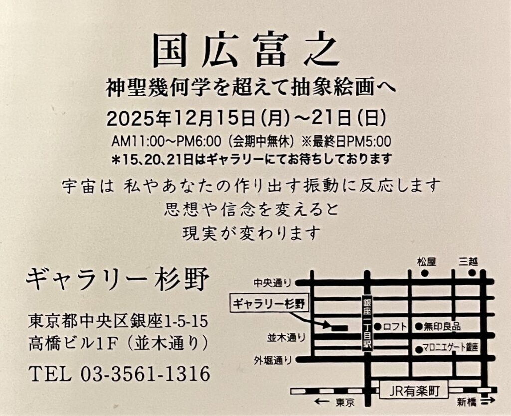 国広富之 個展「神聖幾何学を超えて抽象絵画へ」 2025年12月9日 から takaoka 個展「神聖幾何学を超えて抽象絵画へ」銀座ギャラリー杉野にて12月15日(月)から12月21日(日)まで 国広富之のInstagramでも紹介されています 共有: クリックして X で共有 (新しいウィンドウで開きます) X Facebook で共有するにはクリックしてください (新しいウィンドウで開きます) Facebook 関連